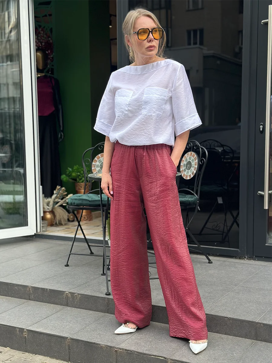 Шовкова блуза з горловиною “човник”, двома нагрудними кишенями, широкими рукавами до ліктя та заокругленим низом.