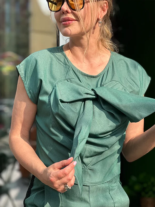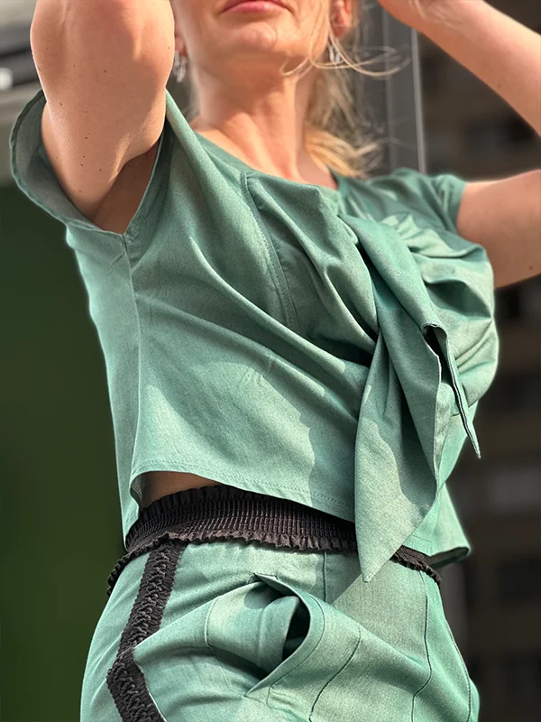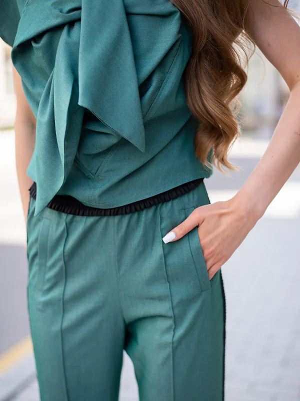 Топ з фігурним серцем -зав’язками. Брюки на резинці з високою посадкою, мереживними лампасами та бічними розрізами