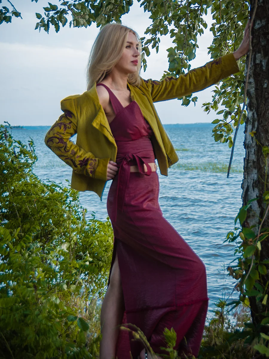Штани прямого крою з передніми кишенями декорованими фрагментом ручної вишивки, застібка – блискавка