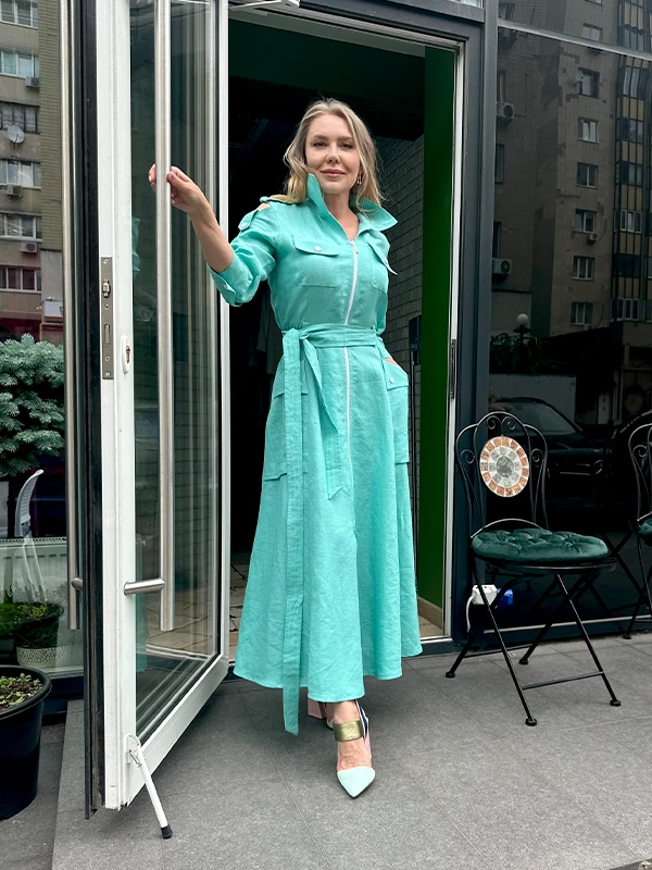 Розкішна довга сукня А-силуету, декорована швами та стильними елементами: великими кишенями, манжетами, довгим поясом.